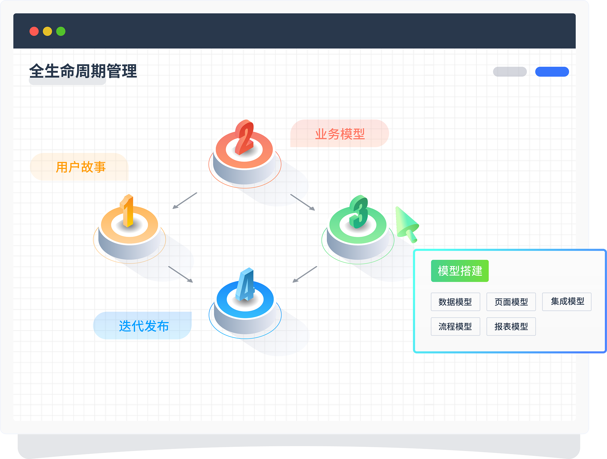 围绕产品的用户故事——模型设计/迭代——模型搭建——模型发布 ,进行系统的全生命周期闭环管理 。